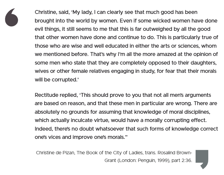 “The man or the woman in whom resides greater virtue is the higher; neither the loftiness nor the lowliness of a person lies in the body according to the sex, but in the perfection of conduct and virtues.” – Christine de Pizan